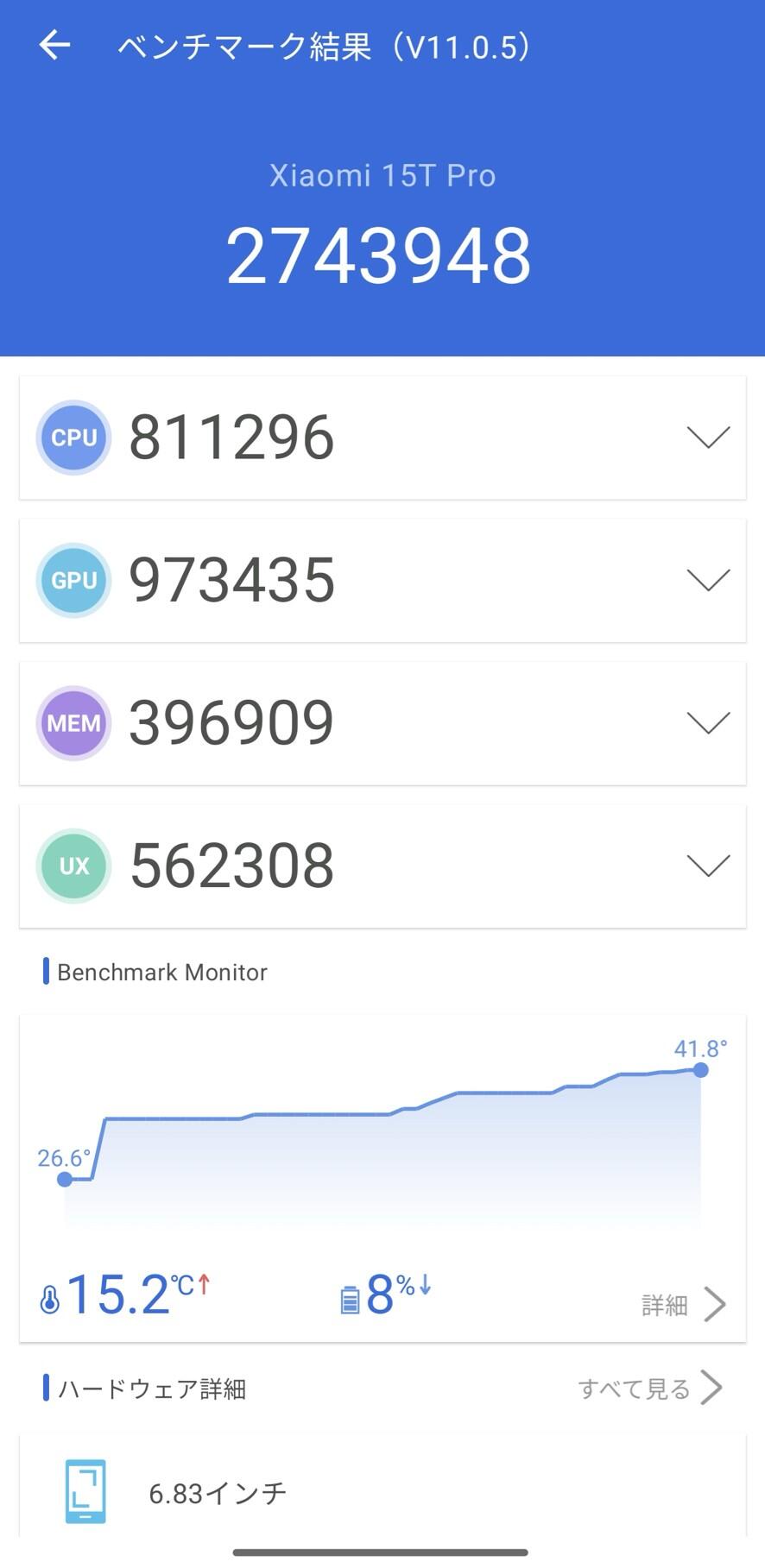 Xiaomi 15T Proのベンチマークスコアは2,743,948でした。2025年11月現在、Androidのトップクラスと言われている約250万点を超えています。